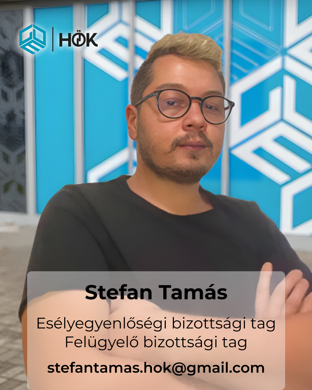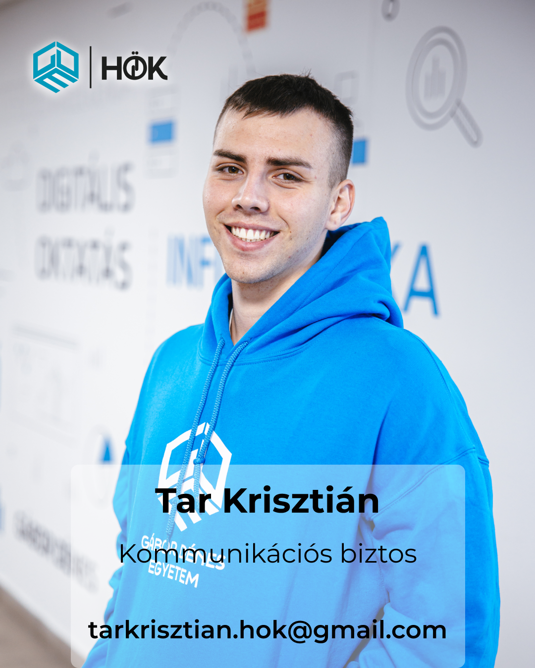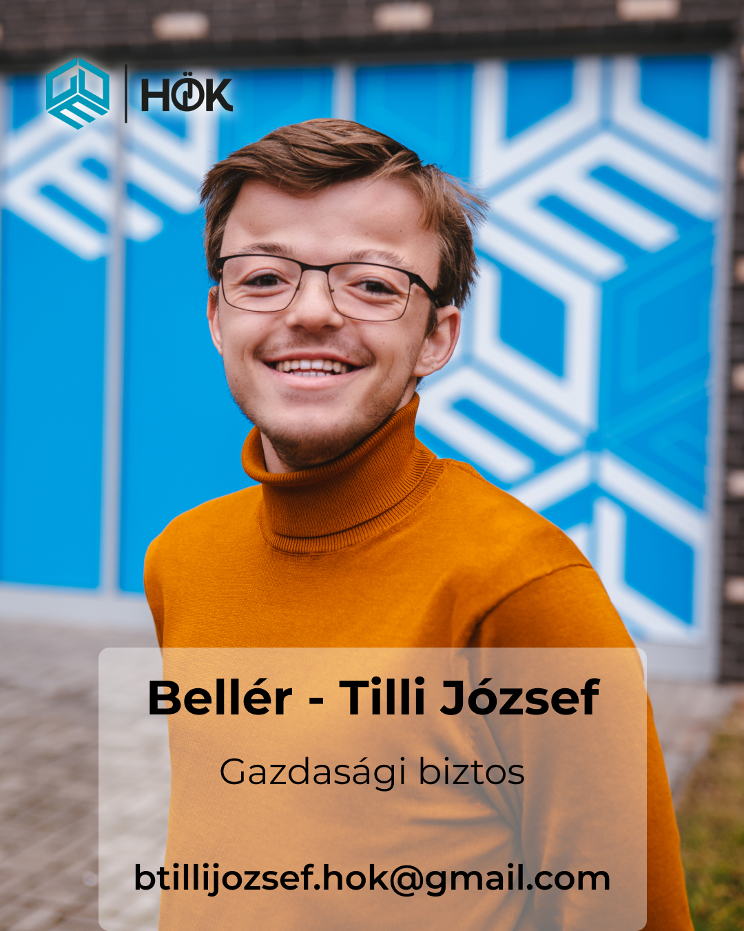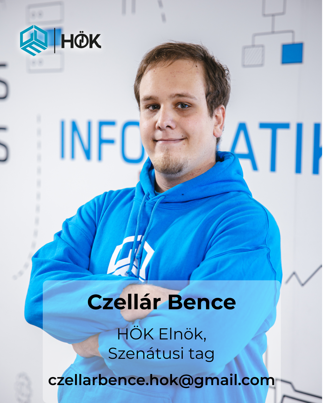 Czellár Bence „Azért csatlakoztam a HÖK-höz, hogy egy támogató és összetartó közösséget építsünk, ahol a hallgatók számíthatnak egymásra. Fontos számomra, hogy mindenkinek segíteni tudjak, mert hiszem, hogy a közösség ereje a kölcsönös támogatásban rejlik. Elnöki pozíciómban ezt kiemelten fontosnak tartom.” |
