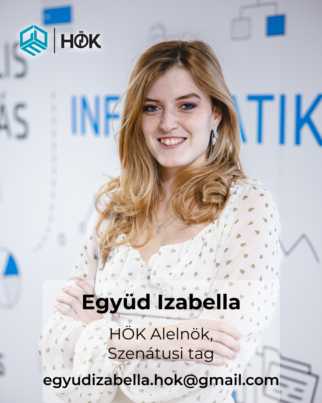 Együd Izabella „Én anno azért jelentkeztem HÖK tagnak, mert célom egy támogató, összetartó és segítőkész közösség létrehozása, ahol a hallgatók egymás mellett állnak, és nemcsak az egyetemi évek alatt, hanem akár életre szóló barátságok is születhetnek a közös programok során. Fontos számomra, hogy minden diáknak segítsek, legyen szó tanulmányi kérdésekről vagy bármilyen más elakadásról. Már tanulmányaim kezdetétől fogva aktívan részt vettem számos egyetemi rendezvényen, segítőként és szervezőként egyaránt. Ezek az élmények megerősítettek abban, hogy szeretném hivatalos keretek között is folytatni ezt a munkát, még több lehetőséget kapva arra, hogy az egyetem programjain segédkezhessek, valamint a hallgatókat összefogjam és támogassam.” |