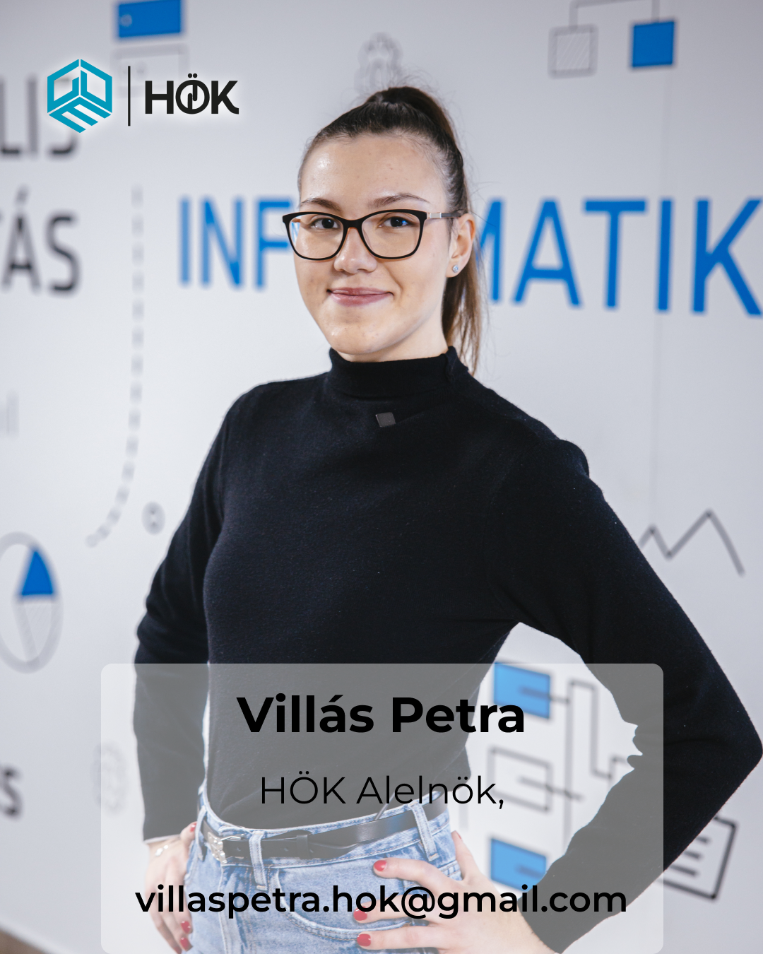 Villás Petra „Alelnökként célom, hogy hatékonyan segítsem az elnök munkáját, valamint támogassam a hallgatói közösség működését. Fontos számomra, hogy aktívan részt vegyek a HÖK feladataiban és a hallgatók érdekeinek képviseletében.” |