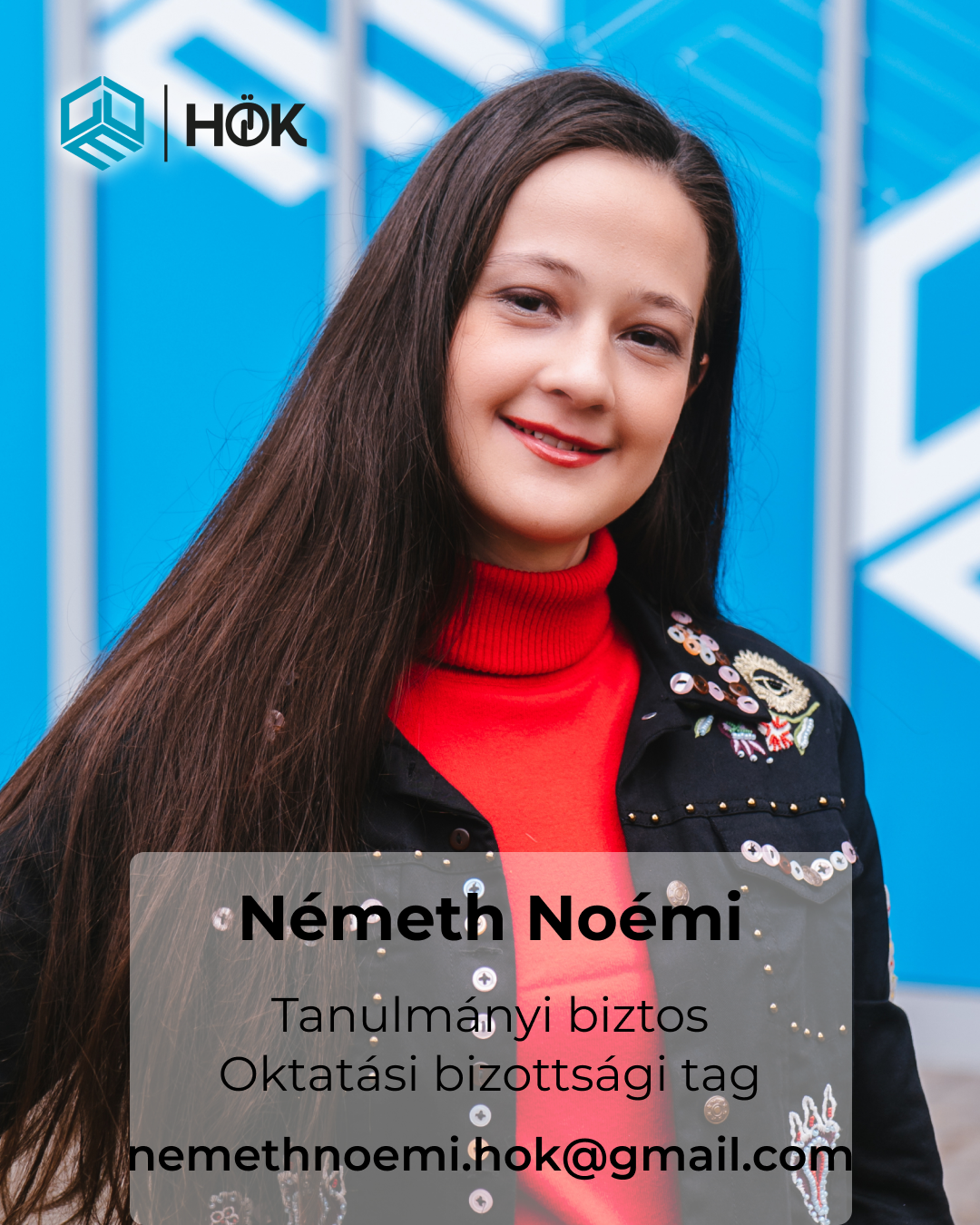 Németh Noémi „HÖK tagságom célja, hogy aktív részese legyek a hallgatói közösség fejlődésének. Szeretném a továbbiakban is képviselni diáktársam érdekeit. Továbbá, hangot adni a hallgatók vágyainak, megvalósítani azokat az ötleteket, amelyek élhetőbbé és inspirálóbbá teszik az egyetemi mindennapokat.” |