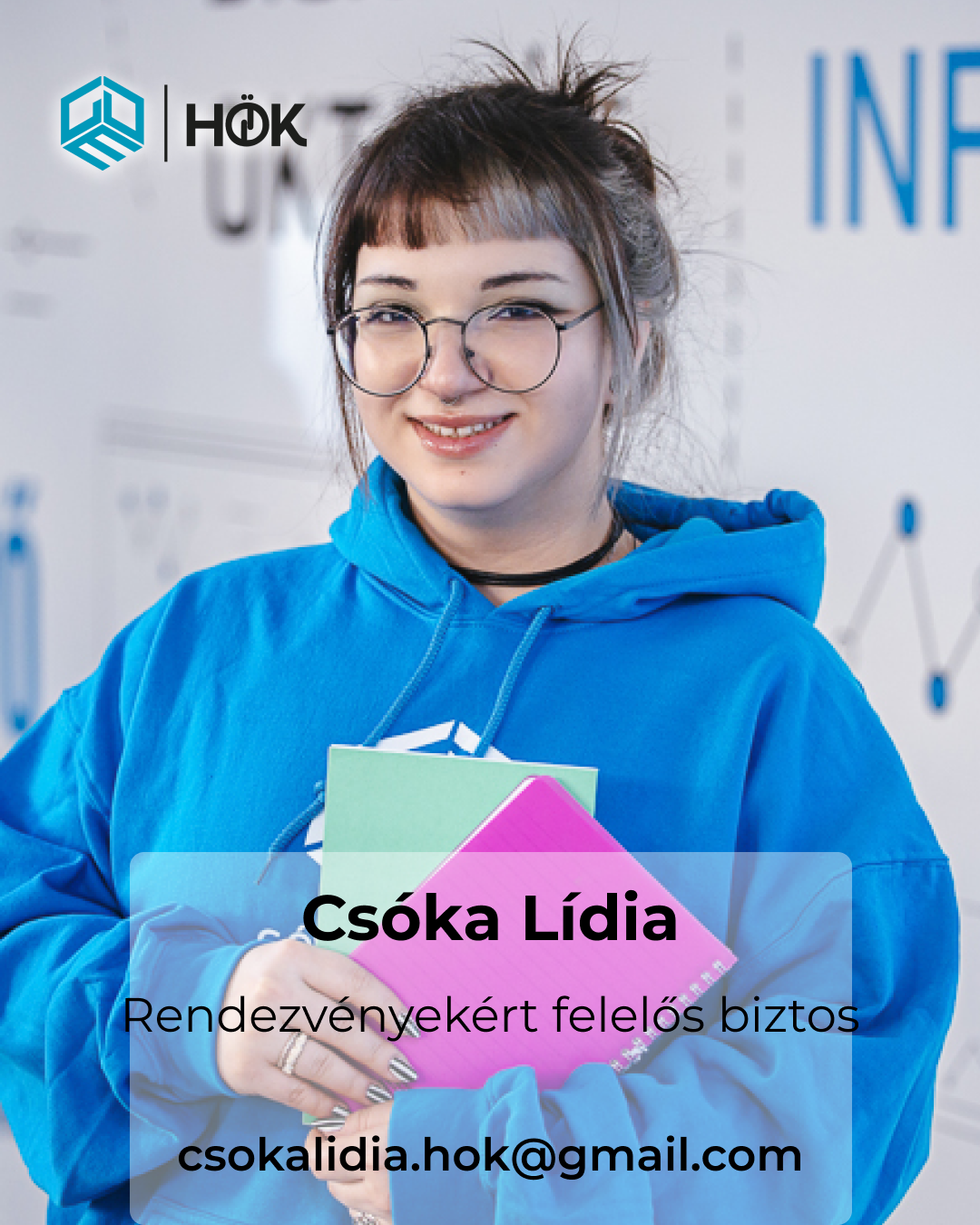 Csóka Lídia „Mérnökinformatikus hallgató vagyok, ez a harmadik félévem és úgy éreztem szeretnék aktívan hozzájárulni a közösség szervezéséhez a Hallgatói Önkormányzat tagjaival. Célom a hallgatók életét érdekesebbé és színesebbé tenni programok szervezésével és ráerősíteni a jó energiákra, ezért csatlakoztam a HÖK-höz.” |