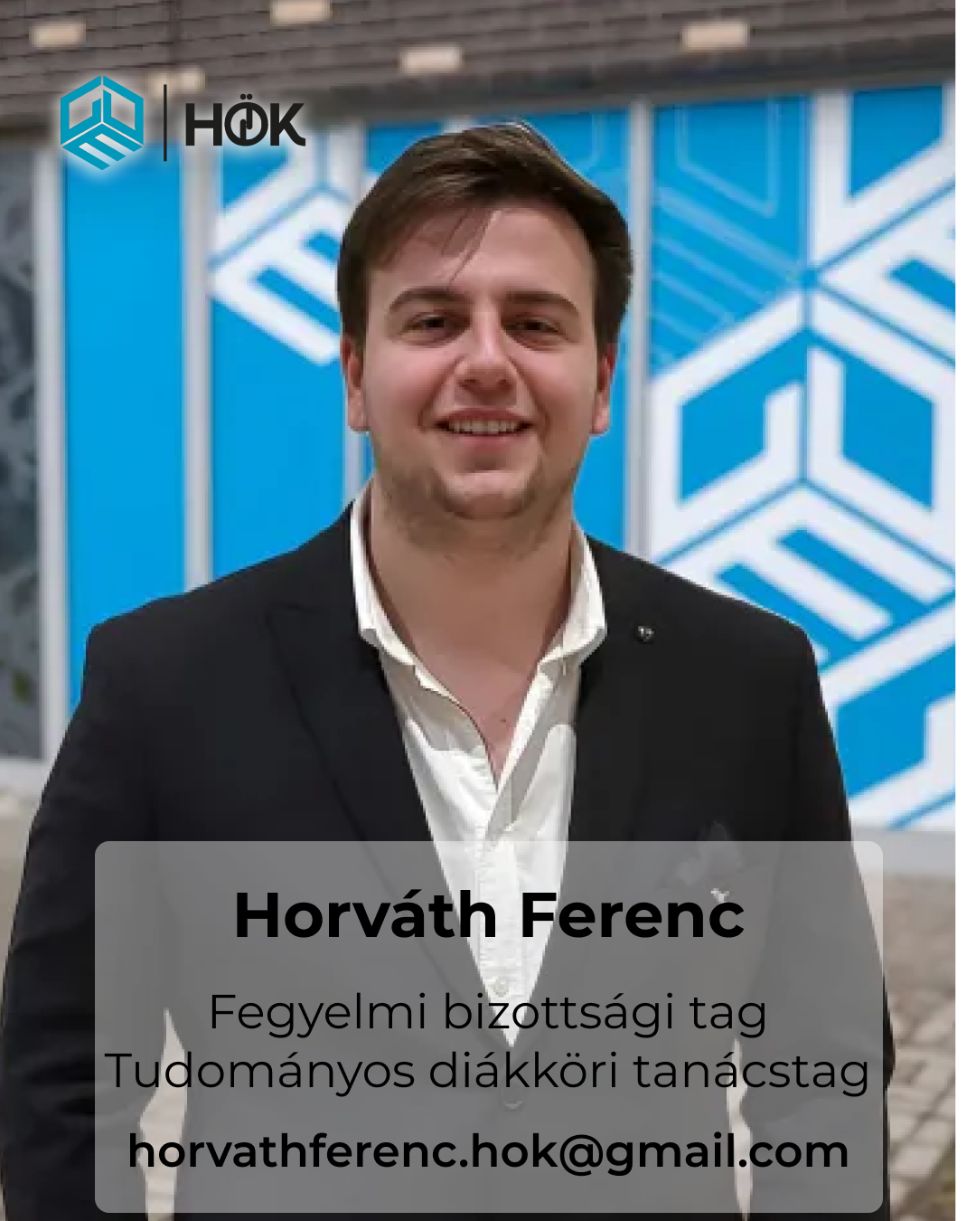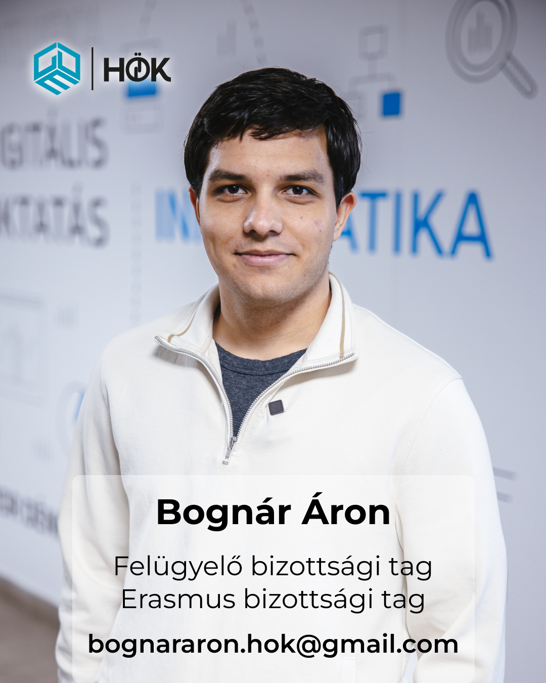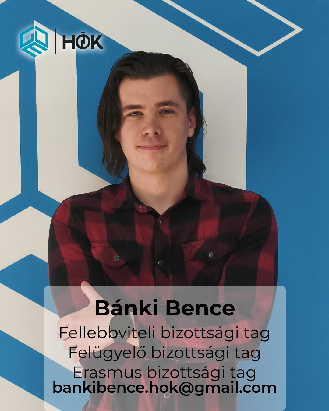 Bánki Bence „Bánki Bence vagyok, harmadéves mérnökinformatikus hallgató. HÖK tagként szeretném, hogy a hallgatók véleményének legyen hangja és igényeik érvényesüljenek az egyetemi döntésekben. Szívesen részt veszek rendezvények lebonyolításában, könnyed és szórakoztató programok szervezésében, valamint a hallgatókkal való kommunikációban, hogy a beiratkozás és az ügyintézés minél gördülékenyebben menjen.” |