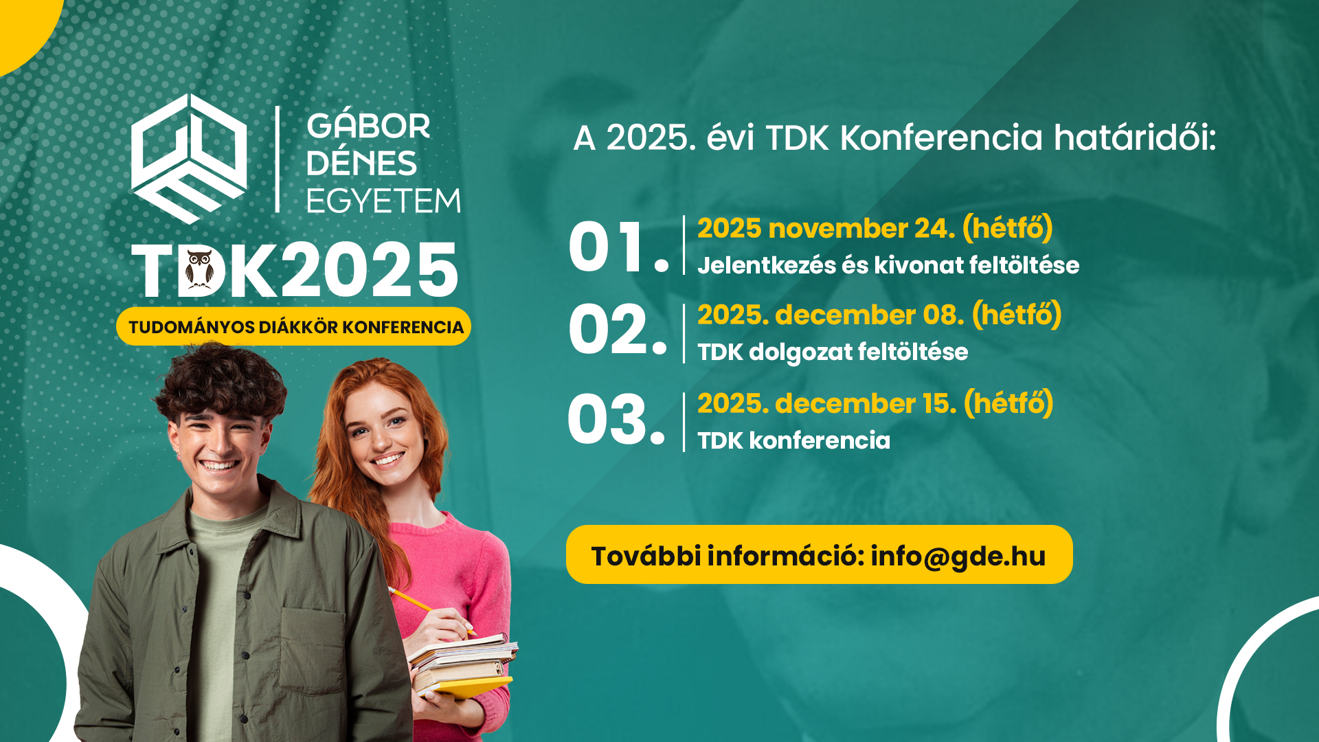 Idén 2025. december 15-én kerül megrendezésre a Gábor Dénes Egyetem Tudományos Diákköri Konferenciája, melyre intézményünk minden hallgatójának jelentkezését várjuk!